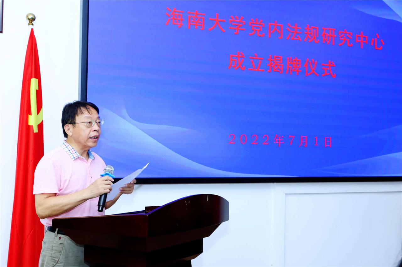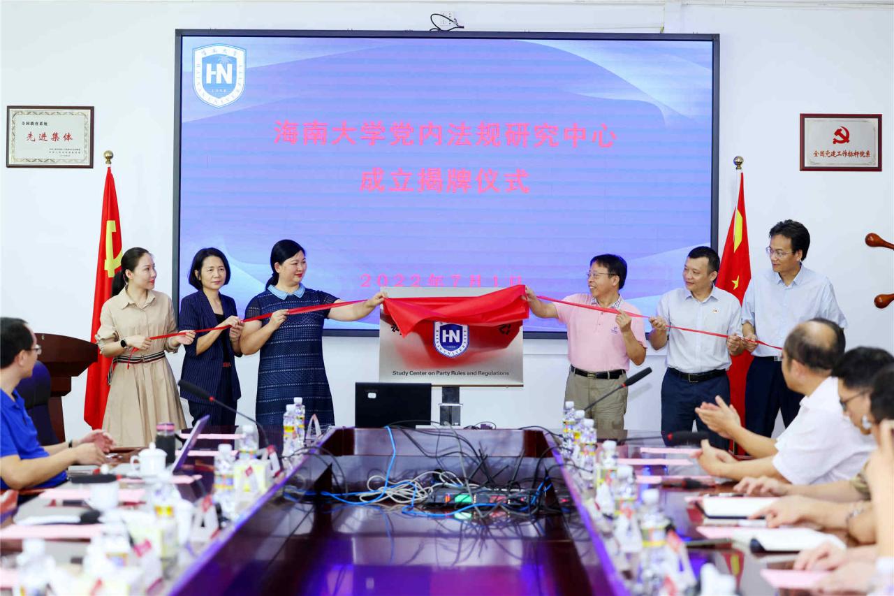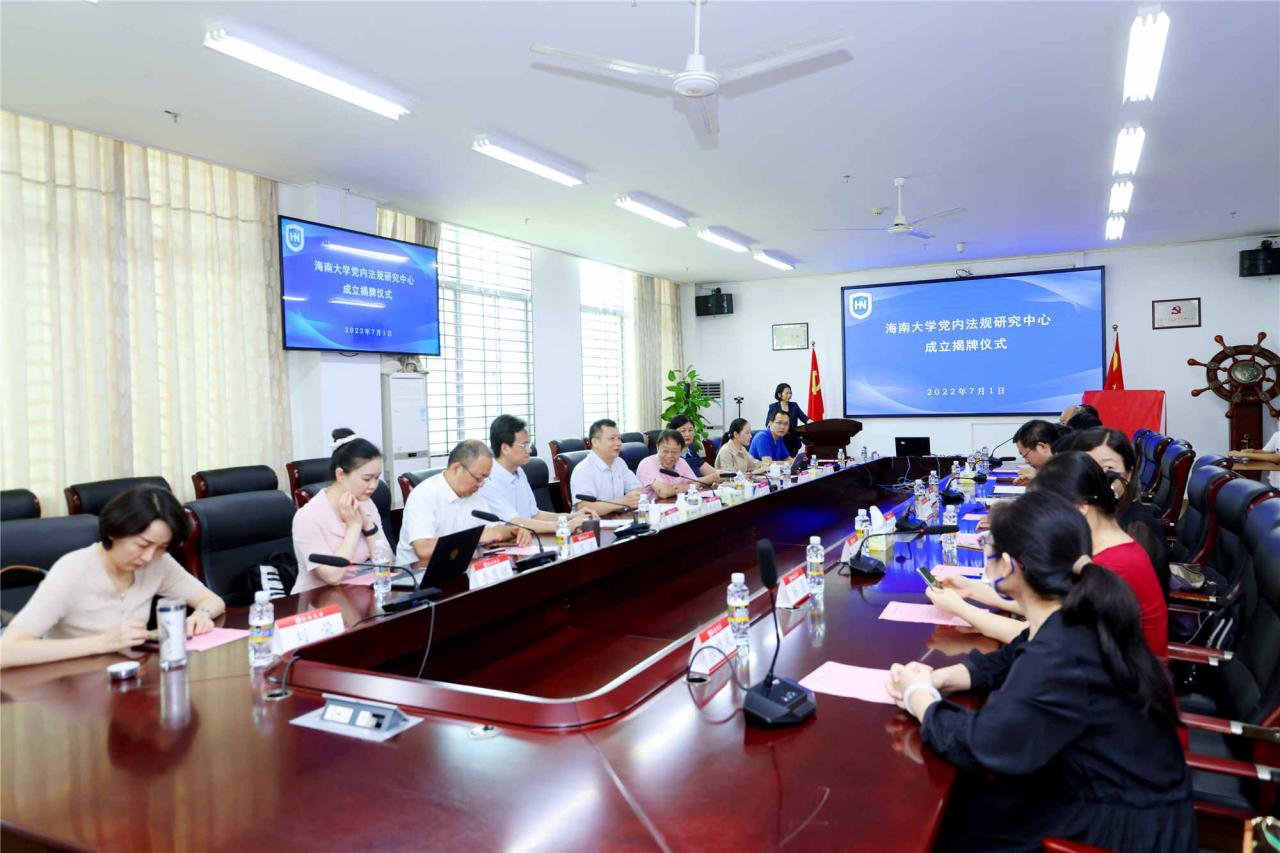 2022年7月1日,海南大学党内法规研究中心成立揭牌仪式在社科楼举行。省委二级巡视员曾红梅,海南大学党委常务副书记王崇敏,党委常委、纪委书记郑尉杰,人文社科处处长徐艳晴等领导出席了仪式。海南大学法公司党政领导班子,各教研室主任,以及太阳集团tyc539部分师生代表参加了成立仪式。仪式由法公司党委书记叶英萍主持。