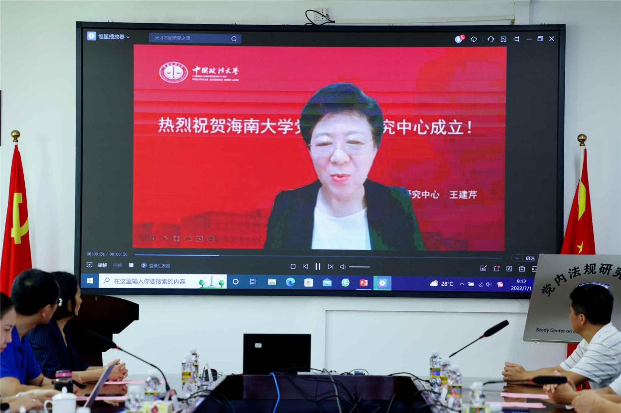 中国政法大学党内法规研究中心主任王建芹为揭牌仪式发来祝贺视频。王建芹教授对海南大学党内法规研究中心的成立表示了热烈祝贺,并指出当前党内法规的理论研究还远远滞后于实践发展。作为中国特色社会主义法治体系重要组成部分的党内法规体系,是法治中国建设最具特色的重要组成部分。王建芹主任希望两公司党内法规研究中心能加强交流,互相支持帮助,共同为党内法规研究事业发展贡献力量和才智。