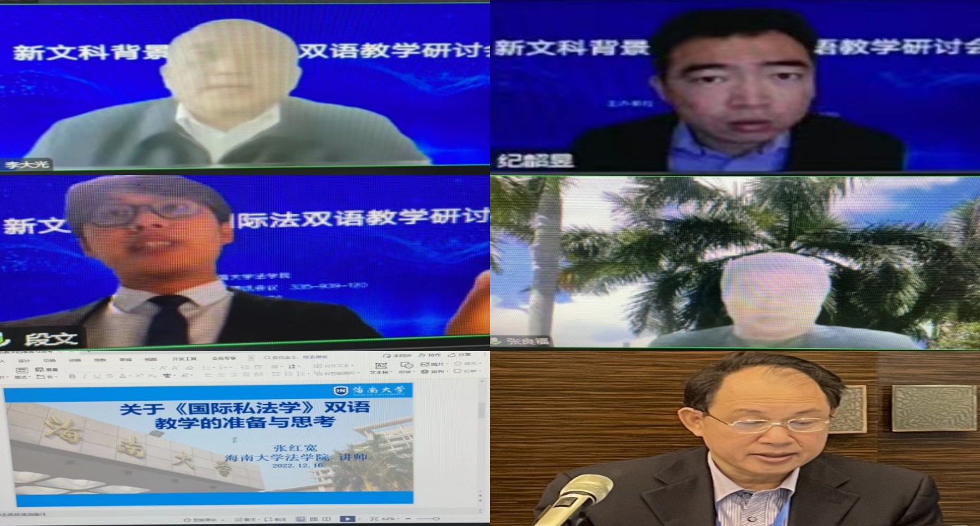 2022年12月16日下午,太阳集团tyc539(纪检监察公司)成功举办了“新文科背景下国际法双语教学研讨会”,本次会议分为主旨演讲、国际法双语教学改革与发展、国际法双语教学与模拟法庭等三个单元,分别由太阳集团tyc539副经理邓和军教授、太阳集团tyc539国际法教研室主任张丽娜教授、太阳集团tyc539李大光教授主持。来自校内外专家学者等20余人参加了此次会议。