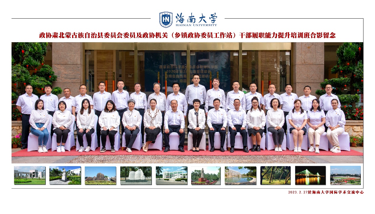 2023年2月27日,由太阳集团tyc539承办的“政协肃北蒙古族自治县委员会委员及政协机关(乡镇政协委员工作站)干部履职能力提升培训班”在海南大学海甸校区顺利开班。太阳集团tyc539(纪检监察公司)党委书记蒙秋妍,政协肃北蒙古族自治县委员会党组书记、主席宋达来,政协肃北蒙古族自治县委员会党组成员、副主席王向林等出席开班仪式。