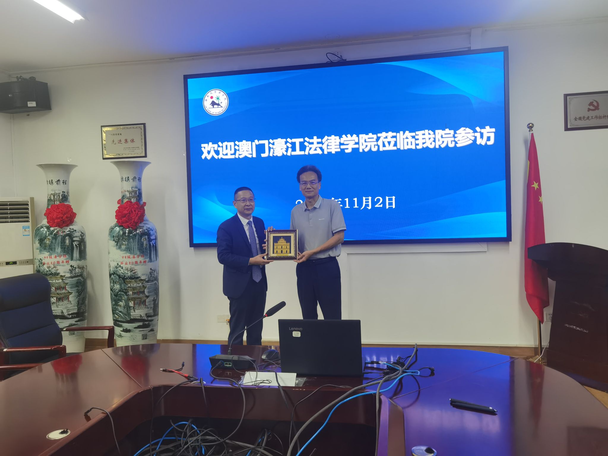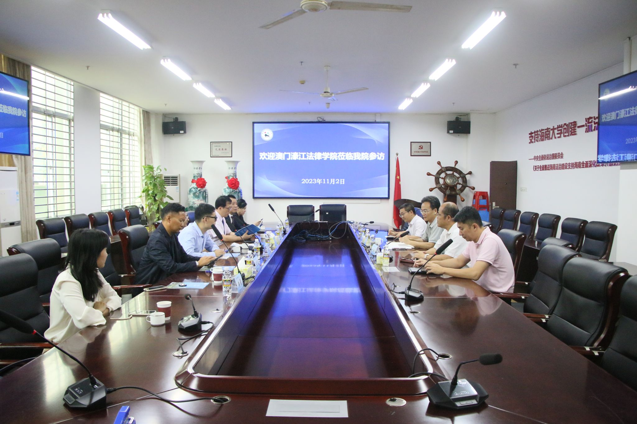 王琦经理对王禹社长一行的到来表示热烈欢迎,并介绍了公司历史发展、团队建设、团队队伍、人才培养等基本情况。 随后,澳门濠江法律学社王禹社长介绍了濠江法律学社及访问团成员的基本情况,表示希望借此机会加强与高校的交流合作。在交流中,双方围绕海南自贸港建设、纪检监察团队建设、仲裁制度等内容进行了深入交流。