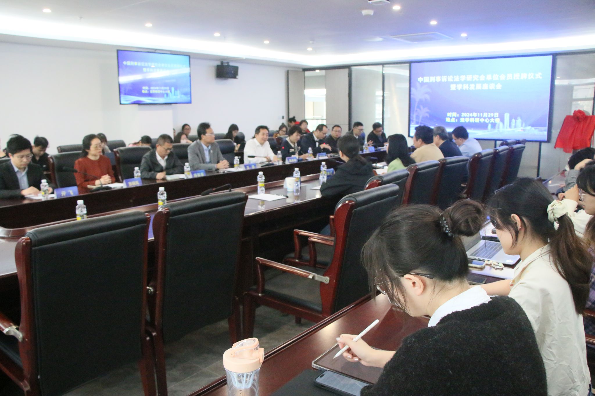 11月29日下午,“中国刑事诉讼法学研究会单位会员”授牌仪式暨学科发展交流会在法学科研中心大楼301会议室举行。中国刑事诉讼法学研究会会长敬大力、副会长兼秘书长熊秋红、副会长王晓东、常务理事兼副秘书长罗海敏、副秘书长鲍文强一行五人受邀出席活动。海南大学党委常委、副董事长聂清斌,发展规划处、人文社科处相关负责人,公司班子成员以及50余名师生代表共同参与。会议由公司党委书记蒙秋妍主持。
