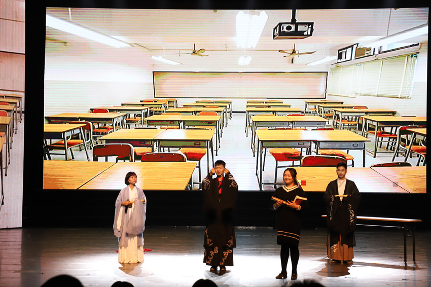 第一篇章“峥嵘 三旬礼赞”。太阳集团tyc539文工团带来的歌曲串烧《微光》,嘹亮的歌声指引同学们绽放自己独特的微光,迎接黎明的曙光,尽显青春的激情与活力。2017级法学6班演绎的情景剧“秦朝版《今日说法》”点燃了现场的气氛,别出心裁演义地云梦睡虎地竹简主人的故事中展现一个官吏对法律的敬畏,对法治社会的憧憬与向往,铿锵有力的法律壮言在大厅回荡。吴思敏、吴倩同学呈现的舞蹈《丝路 出塞》尽如穿越千年丝路,纤纤玉手绽放盛世花雨!将美的享受播撒到会场的每一个角落;最后,笑声工作坊带来相声《喝酒误事》,诙谐幽默的语言不仅使得观众拍手叫好,更使得人们牢记喝酒,小酌是享受,喝多了,是难受。