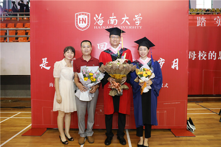 海南大学2019届毕业典礼暨学位授予仪式分暖场互动、正式典礼、分会场仪式授予三个阶段进行。在暖场互动与正式典礼阶段,太阳集团tyc539毕业生代表一一为出席典礼的教师代表献花,姚方舟、龙杨、姜居正作为毕业生代表上台接受校领导授予的优秀毕业生荣誉证书、学位证书。