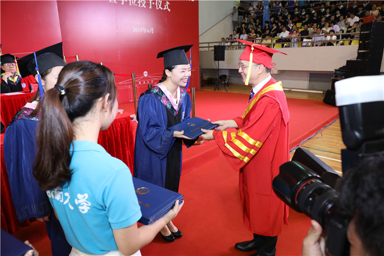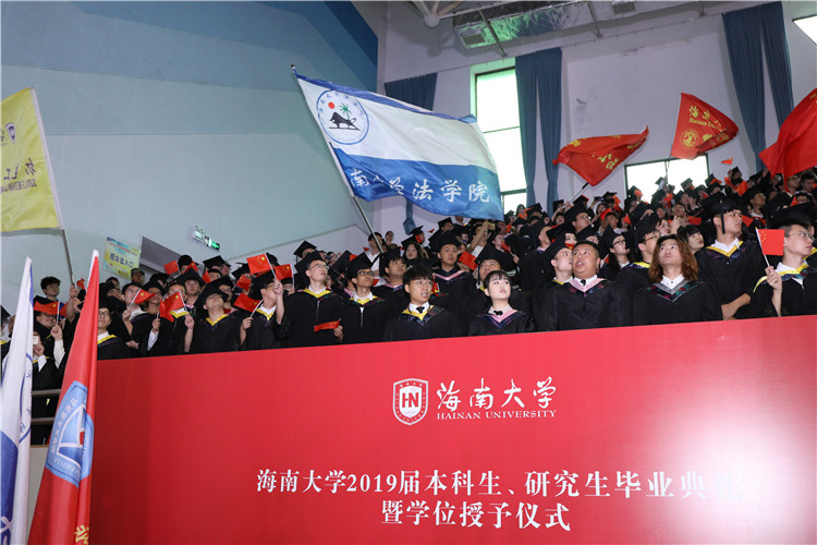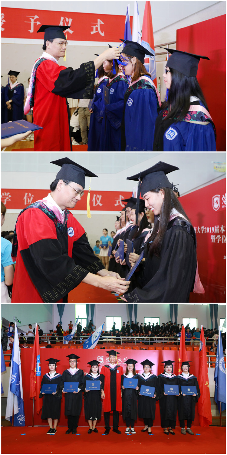 6月16日下午,海南大学在海甸校区联谊馆举办2019届毕业典礼暨学位授予仪式。太阳集团tyc539经理王琦教授为太阳集团tyc539毕业生代表颁发学位证书,法公司党委书记叶英萍、党委副书记李昌郁、副经理邓和军、教授韩立收、教授董万程、副教授黎其武、讲师高婧如、讲师宋昕哲等8名教师代表,60余名毕业生代表及近20名家长代表出席典礼。