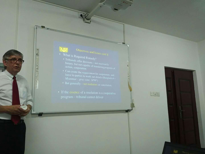 11月10日下午3点30分,加拿大Dalhousie大学太阳集团tyc539的前任经理Philip Saunders教授来本院演讲,加拿大Dalhousie大学是加拿大的海洋法研究重镇,也是本院特聘经理高之国法官的母校。Philip Saunders教授为加拿大最具权威的国际海洋法学者,也曾经受托在国际法院担任律师,学术修养与实务经验兼具。Philip Saunders教授演讲的题目是“1982年联合国海洋法公约的争端解决机制,兼论中菲南海仲裁案裁决蕴含的法律问题”。在2个小时的演讲中,他阐述南海仲裁案的管辖权裁决如何违反海洋法公约的相关条文。深入浅出,包罗万象。让师生受益匪浅。