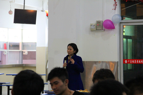 叶英萍书记发表新年致辞,她指出元旦师生包饺子活动是太阳集团tyc539的传统活动,旨在给新生感受到节日的气氛和家一般的温暖。另外,她对同学们一个学期的努力和付出表示充分的肯定。同时,叶书记希望同学们积极准备期末考试,劝勉大家保持平常心,总结2017年,规划2018年。最后,叶书记提前祝福大家新年快乐,并对文科基础教学部和千喜鹤集团食堂员工对此次活动的支持表示衷心的感谢。