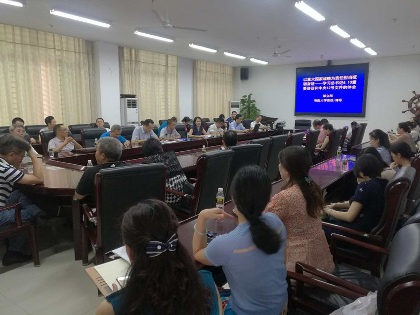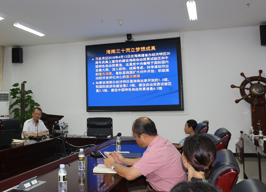 在会上,海南省五一劳动奖章获得者、博士生导师邹立刚教授作了主题为《以重大国家战略为责任担当砥砺奋进——学习习近平总书记4.13重要讲话和中央12号文件的体会》的专题报告。报告中,邹立刚教授通过图文并茂的PPT文稿方式,围绕海南改革开放的历程和全面改革开放的现行模式、海南建设自由贸易园(港)区体制机制创新、我国和海南全面改革开放的国内北京和国际背景、海南的特殊地位和服务国家重大战略等内容,分享学习习近平总书记4.13重要讲话和中央12号文件的体会,给教职工带来耳目一新的感受。