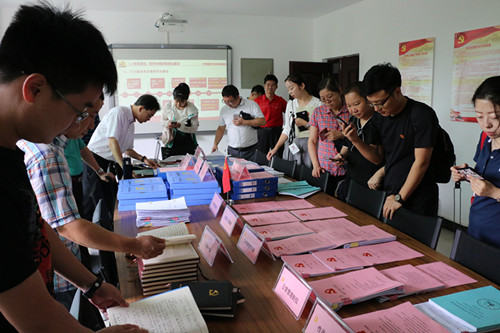 公司党务联系人安睿颖在党员活动室向培训班学员介绍公司党组织标准化建设情况