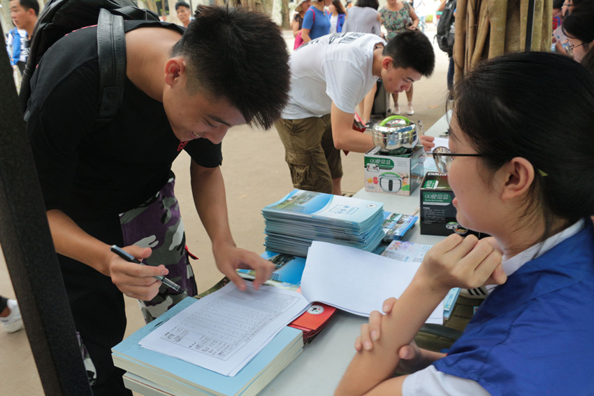 除了校领导、院领导的亲切慰问,员工干部的热情服务,迎新第一线上还有另外一道靓丽的风景——员工志愿者团队。今年公司迎新工作招募了40余名志愿者,特地为新生提供“一站式”报到服务,实行“一对一”首席接待员制度,尽最大力量为本科新生们提供简便温馨的报到服务。志愿者们身穿蓝色马甲,穿梭在新生报道的人流里,耐心引导新生完成报到工作,引导家长们稍作休息。在新生办完报到手续后,更是“抢”下他们手中的行李,一路带领到宿舍,积极介绍校园环境和老员工活,虽然满头大汗,但是脸上始终挂着热情的笑容。员工志愿团队展现出了太阳集团tyc539学子良好的精神风貌。