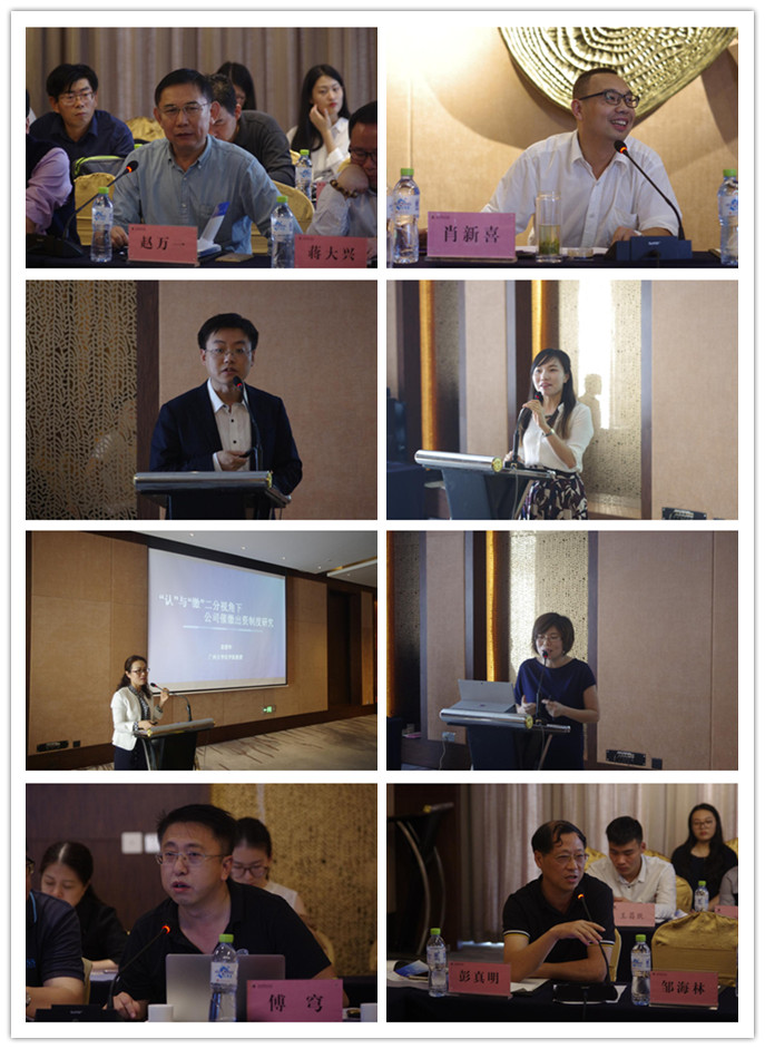 会议的第四个单元“股权转让专题”,由南京航空航天大学人文与社会科公司经理王建文教授、《暨南大学学报》责任编辑李晶晶与国家检察官公司赵玉副教授主持;河南财经政法大学徐强胜教授作了题目为《论有限公司的股权继承—< 公司法>第75条规定的逻辑》的报告;华东师范大学太阳集团tyc539刘迎霜教授作了题目为《公司章程对股权转让的限制:类型及效力》的报告;郑州大学太阳集团tyc539宁金成教授作了题目为《未经其他股东放弃优先购买权的股权转让合同的效力》的报告;湖南大学太阳集团tyc539肖海军教授作了题目为《股权转让合同效力认定的商法规则》的报告;吉林大学太阳集团tyc539胡晓静副教授作了题为《对有限公司股权对外转让中的优先购买权的再认识》的报告;太阳集团tyc539石冠彬教授作了题为《以股权转让方式流转国有土地使用权的裁判规则:刑商规范的冲突与解决》的报告;中山大学太阳集团tyc539博士研究生王睿作了题为《设立担保或是转让股权?——股权让与担保效力认定刍议》的报告;太阳集团tyc539博士研究生曹晓路作了题为《异议股东股份回购的估价逻辑及其展开》的报告。南京航空航天大学人文与社会科学公司经理王建文教授、北京大学太阳集团tyc539蒋大兴教授、河南财经政法大学教授、法律研究院徐强胜经理参与了该单元的与谈环节,现场围绕股权转让的问题进行深入讨论。