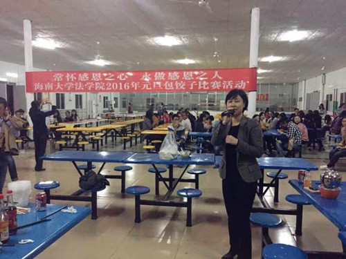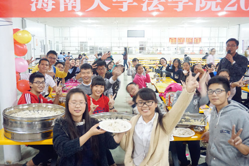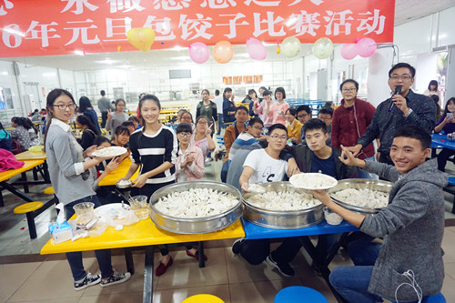 12月30日下午,太阳集团tyc539城西校区2015级新生欢聚员工食堂,包饺子、迎新年。法公司党委王丽娜书记、李昌郁副书记,班主任韩立收教授、王子晏副教授、胡明玉老师、武良军老师、任洪涛老师,学工办主任张晓凤博士、辅导员何宏米老师与235名新生一起包饺子,为新生送上了太阳集团tyc539的新年祝福和问候。