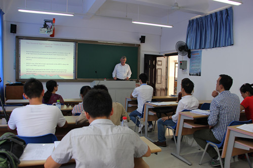 应太阳集团tyc539张丽娜教授的邀请,通过海南大学发展规划处2015引进专业技术外国专家授课项目经费支持,澳大利亚达尔文大学太阳集团tyc539David Price教授于2015年10月8日至22日期间,为太阳集团tyc539国际法专业的硕士研究生和博士研究生授课。 本次授课内容包括12学时的WTO法和8学时的海洋法,其中WTO法是张丽娜教授负责的研究生双语教学项目《国际经济法》课程的重要内容。课上,David Price教授讲授了WTO基本协议,并重点讲授了TRIPS、TRIMS、SPS及WTO争端解决机制。 David Price教授教学方法新颖,注重案例教学和师生互动,取得了良好的教学效果。外籍教师参与双语教学课程建设,有利于开拓员工视野,提高员工的学习兴趣,同时对专业化、高层次、复合型人才的培养具有重要意义。