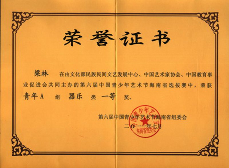 今年七月份,在由文化部民间文艺发展中心、中国艺术家协会、中国教育事业促进会共同主办的第六届中国青少年艺术节海南省选拔赛中,2009级梁林同学荣获青年A组器乐类一等奖。(注:青年A组为16岁以上西洋乐器参赛选手参加)