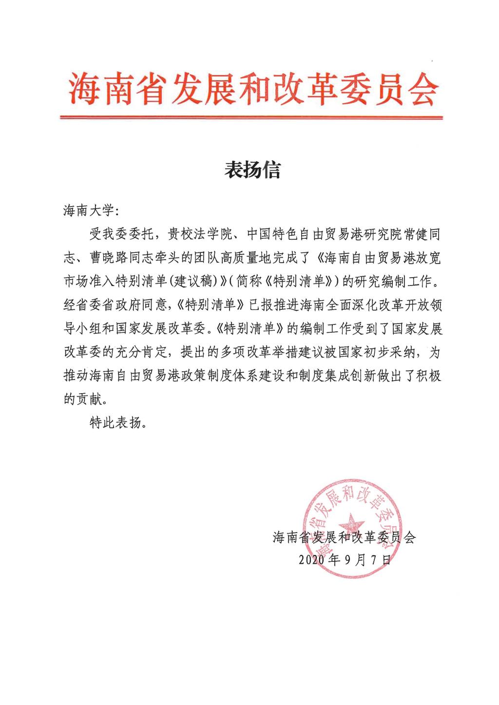 海南省发展和改革委员会表扬信