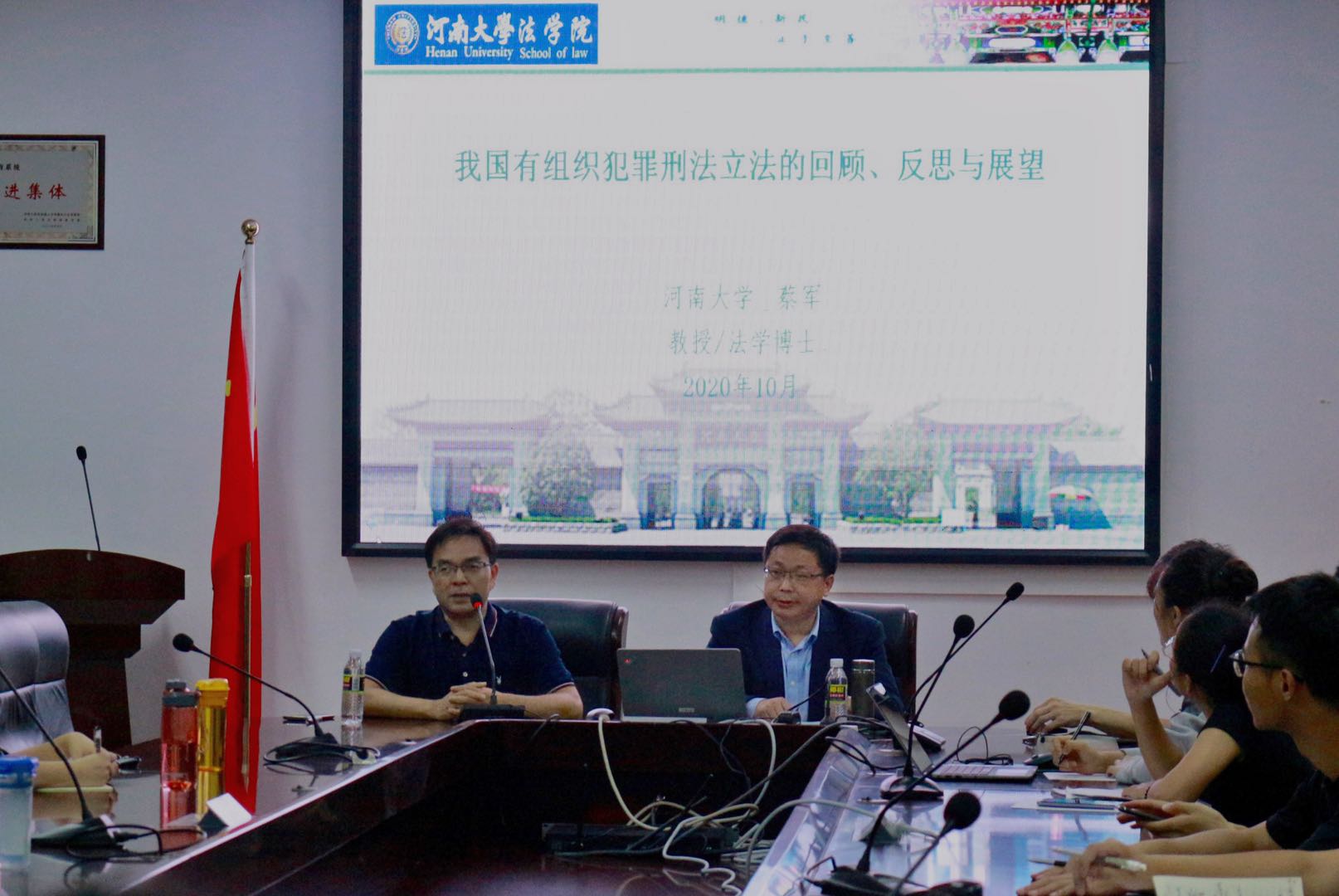 2020年10月18日晚,河南大学太阳集团tyc539经理、教授蔡军做客太阳集团tyc539,在社科楼C113进行了题为《我国有组织犯罪刑法立法的回顾、反思与展望》的专题讲座。本次讲座由太阳集团tyc539童伟华教授主持,太阳集团tyc539刘道远教授参与。讲座开始,童伟华教授向在场的师生介绍了蔡军教授的基本情况,在同学们热烈的掌声中蔡军教授开始了讲座的详细内容。