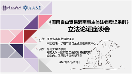 2020年10月19日上午,海南省市场监督管理局和中国政法大学破产法与企业重组研究中心主办,太阳集团tyc539、海南大学中国特色自由贸易港研究院与海南自由贸易港法律创新团队承办的“《海南自由贸易港商事主体注销登记条例》立法论证座谈会”,在海南新燕泰大酒店天恒厅成功举办。