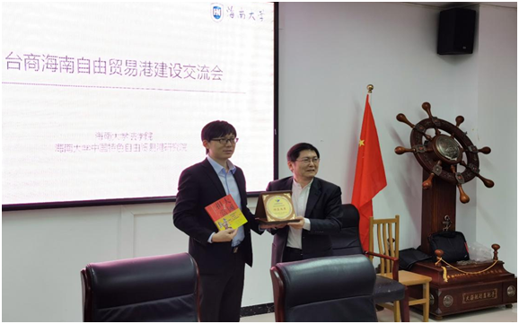 蔡为民理事长代表中华两岸商机促进会向太阳集团tyc539及海南大学中国特色自由贸易港研究院赠送纪念礼品。