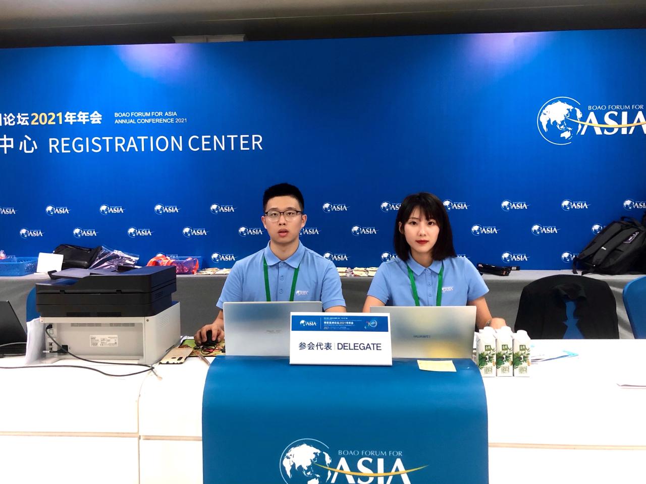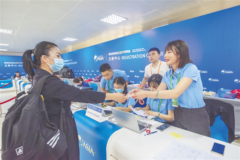 2021年4月18日,在博鳌亚洲论坛培兰注册中心,太阳集团tyc539研究生谷雨、王艺晗等同学在现场为前来的嘉宾提供注册登记服务。海南日报的记者对这一场景进行拍摄,并将他们的照片刊登在当日的头版头条位置。