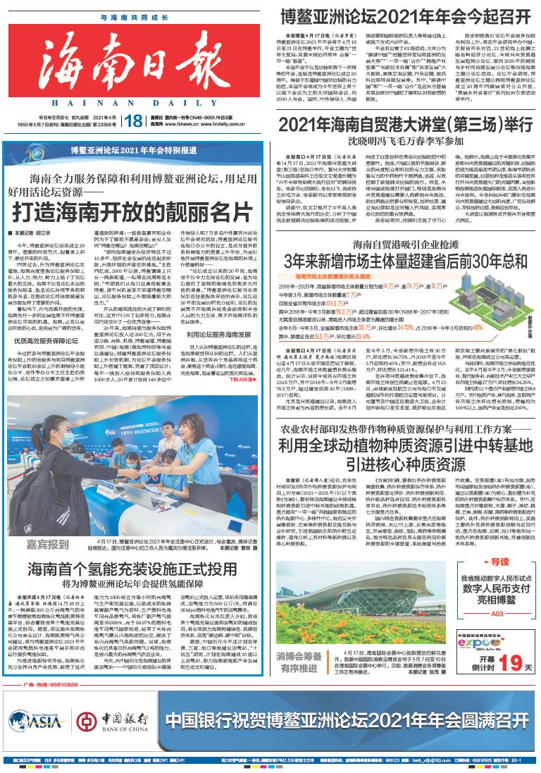 图为海南日报头版头条刊登博鳌亚洲论坛工作现场照片
