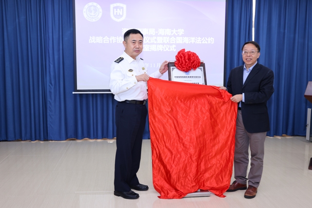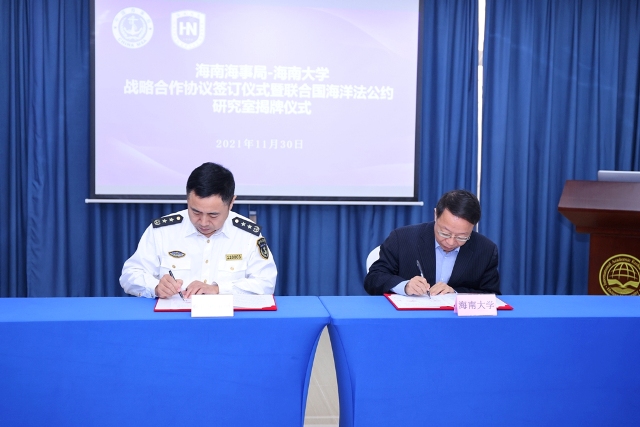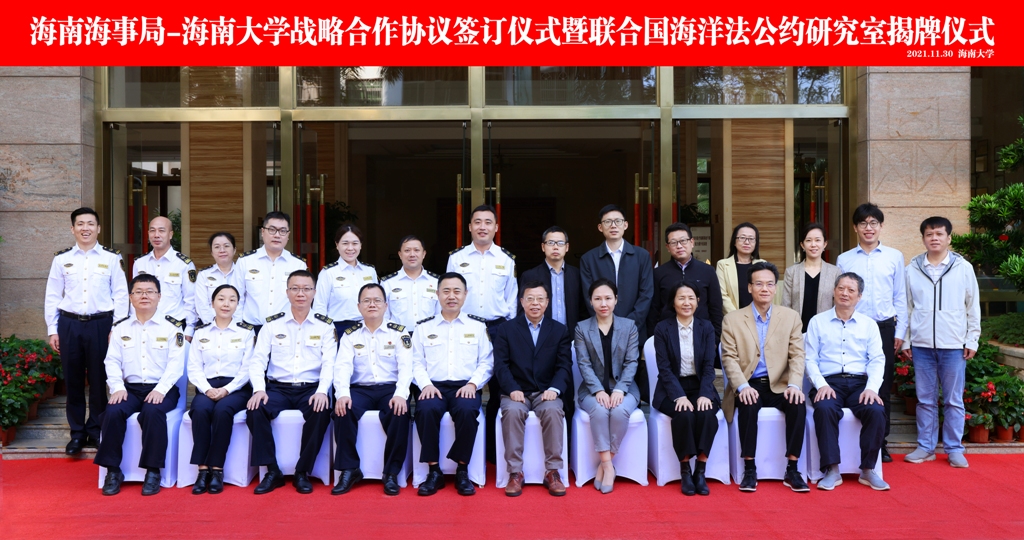 海南大学与海南海事局于2021年11月30日在海南大学举行战略合作协议签订仪式暨联合国海洋法公约研究室揭牌仪式。海南大学党委常委、副董事长王崇敏,海南海事局副局长吴平生,双方职能部门负责人以及联合国海洋公约研究室成员出席了本次活动。