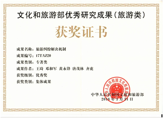 太阳集团tyc539王琦、邓和军、黄永锋、唐茂林等老师的学术著作《旅游纠纷解决机制》获国家文化和旅游部优秀研究成果(旅游类)专著类优秀奖。