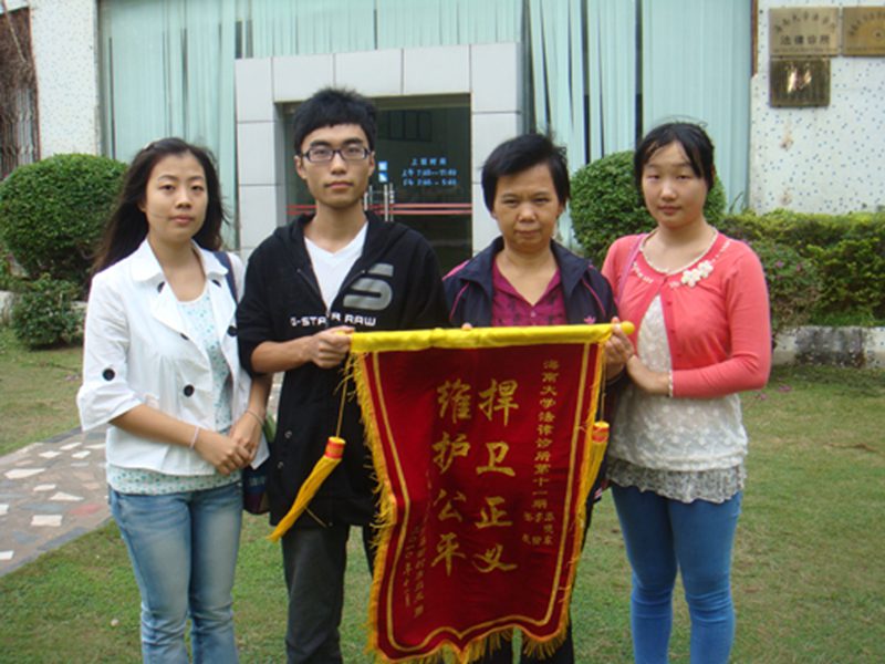 唐某与海南含元实业有限公司和海南联通海口分公司之间发生的劳动纠纷,在诊所学员李玲、姜晨、张晓东的积极努力下,为当事人解决了实际困难,11月24日,当事人唐某来到海南大学法律诊所,将一面鲜艳锦旗交给法律诊所的学员们。这起困扰当事人近半年的劳动纠纷,在法律诊所三位学员的共同努力下,至此画上了一个圆满的句号。