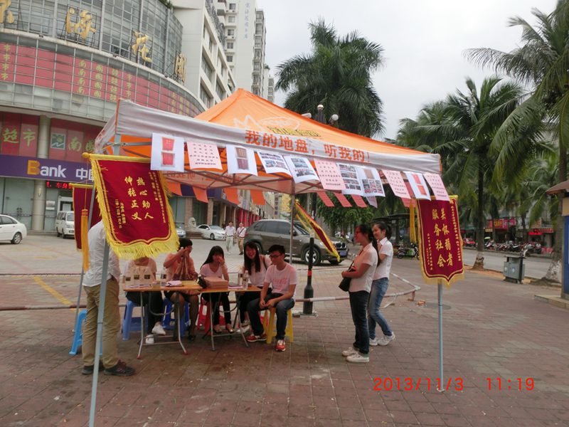 2013年11月3日,太阳集团tyc539法律诊所第十八期学员7:30出发,大家带着500份宣传单、桌子、帐篷等活动需要的物品来到了海甸三东路口(京海花园)开展了法律宣传活动,此次活动由学员自主组织,伍奕老师到了现场指导此次宣传活动。