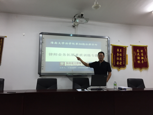 2016年10月8日晚,海南嘉天律师事务所党支部书记王龙奎律师应公司邀请,给第二十四期法律诊所的学员们举办了一堂别开生面、别具一格的专题实务讲座:“律师业务拓展训练”。 开场后,王律师就自己多年的律师执业经历做了简单介绍。以知识是否等于财富作为引言。引导同学们正确对待法律职业和财富的关系。首先,王律师结合了自己早年的执业经历,为同学们深刻阐述了律师界的六字箴言:“专业、做人、技能”,引发了同学们深入的思考,在座同学纷纷表示要提高自己的核心竞争力,努力学习好专业知识。王律师讲到,法律是一门社会管理科学,对规范社会秩序,保障社会安定起着重要的作用,我们在学习法律知识时,不能仅仅满足于课堂上的学习,还要开阔眼界,多参加法律实务活动,用自己所学到的知识去指导实践。