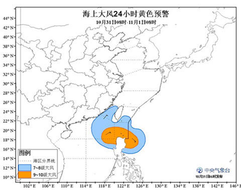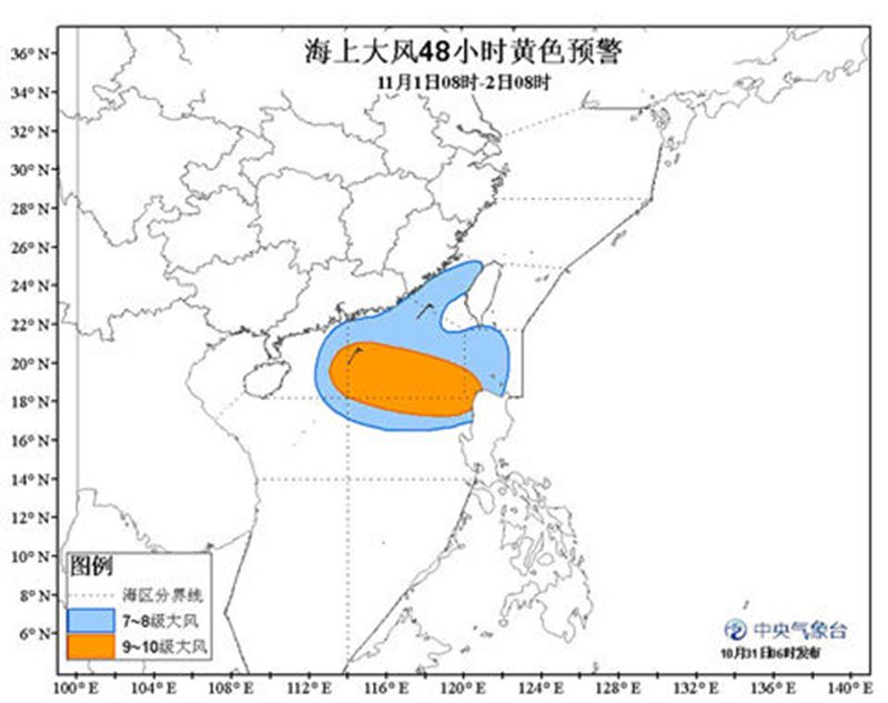 中央气象台10月31日06时继续发布海上大风黄色预警: