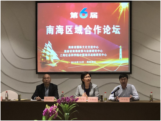 2018年10月20日,由海南省国际文化交流中心、海南省南海政策与法律研究中心和上海社会科公司中国海洋战略研究中心联合举办的“第六届南海区域合作论坛”在海南省澄迈县举行,来自自然资源部、中国社会科公司中国边疆研究所、中国海洋石油集团有限公司、国防大学、武汉大学、中南财经政法大学、大连海事大学、上海海事大学、华东政法大学、英国中央兰开夏大学、香港亚太研究中心、台湾政治大学、台湾师范大学等的40多位专家学者与会。
