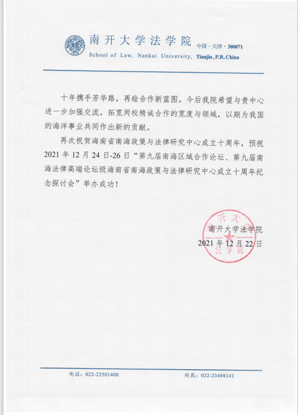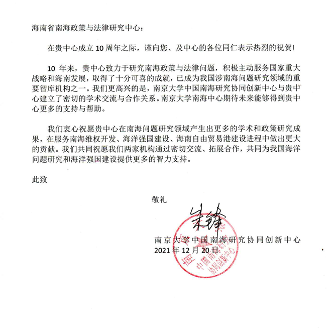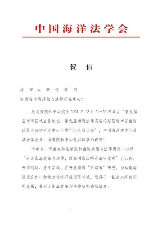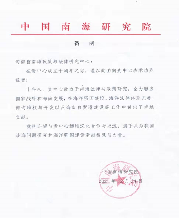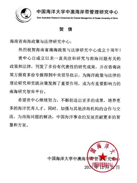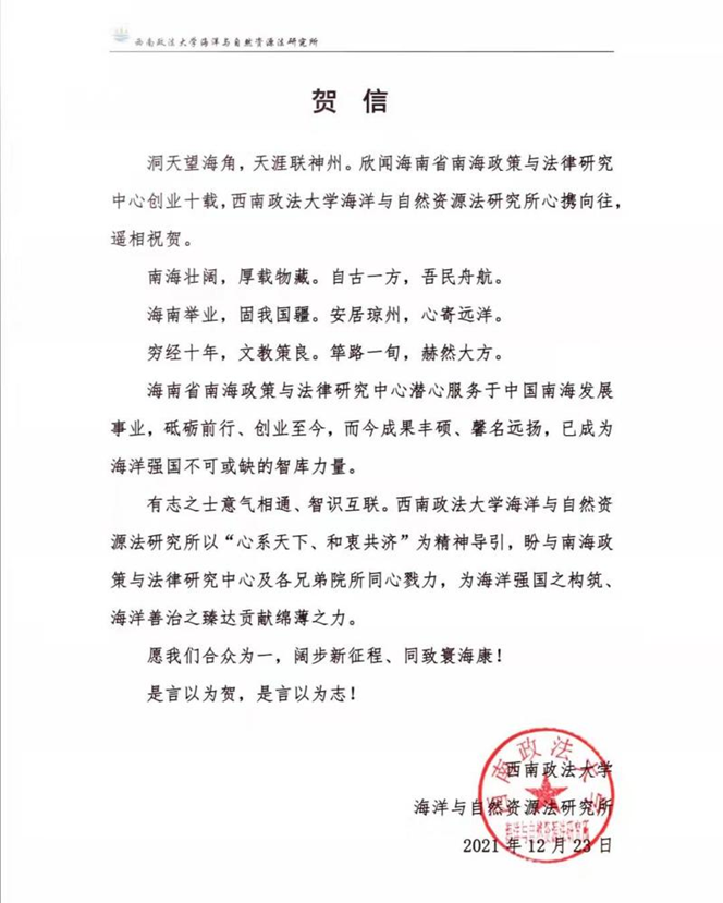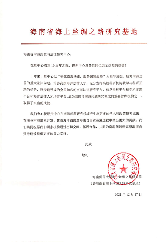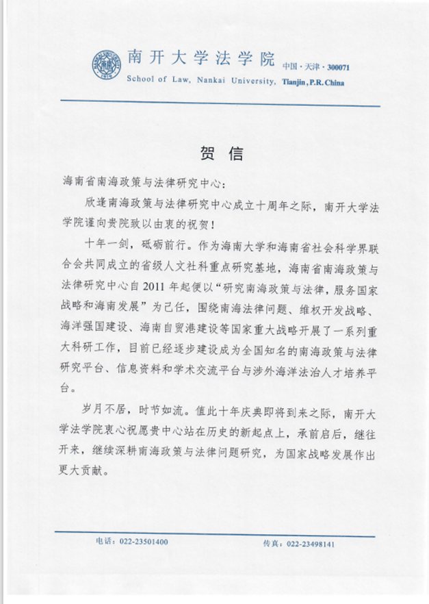 海南省南海政策与法律研究中心在成立10周年之际收到了18家国内兄弟院校、研究机构和有关部门的贺电、贺信、贺函。