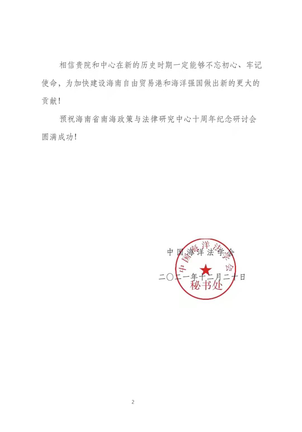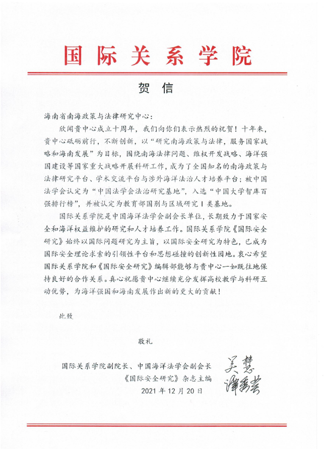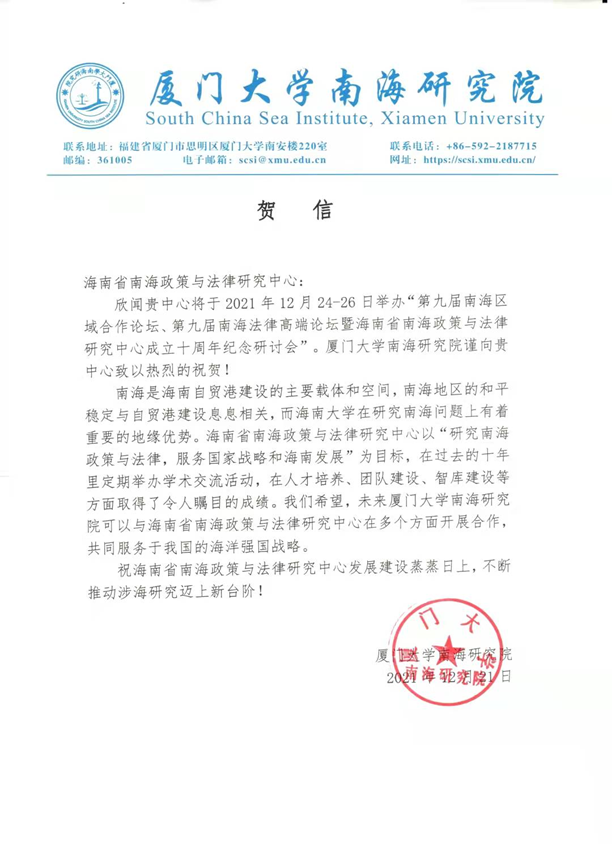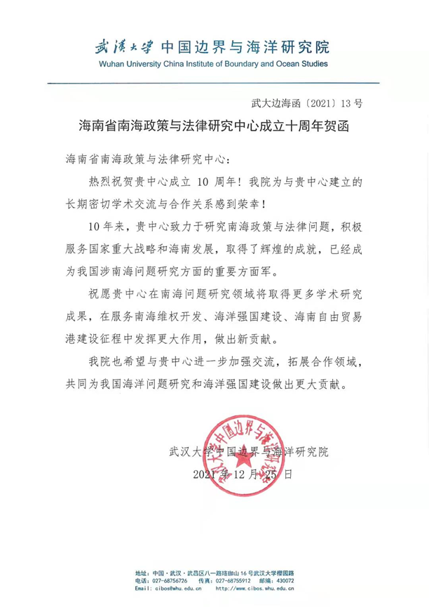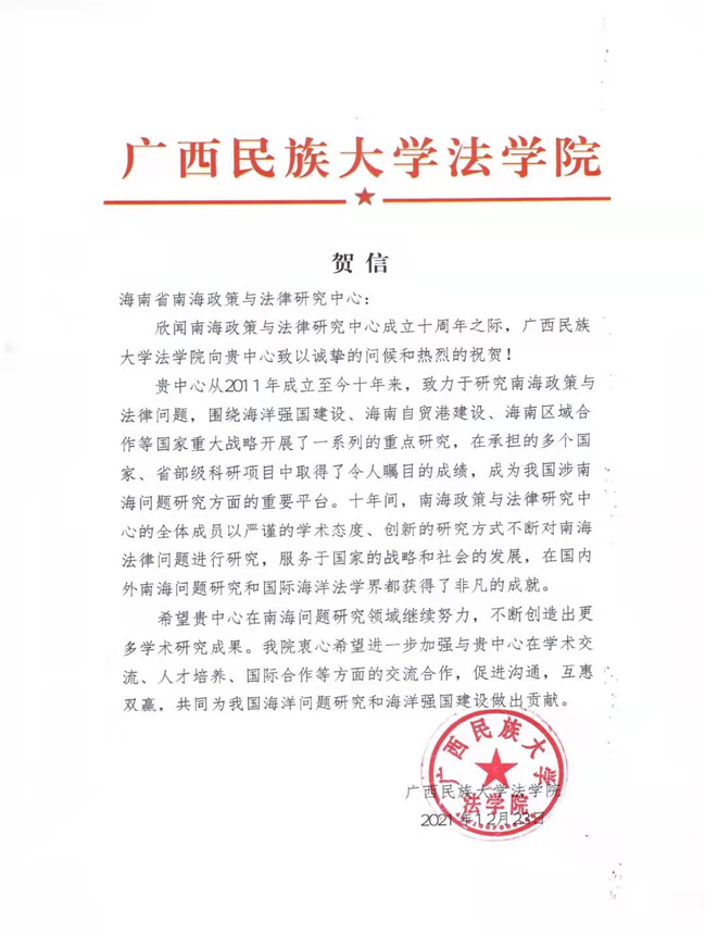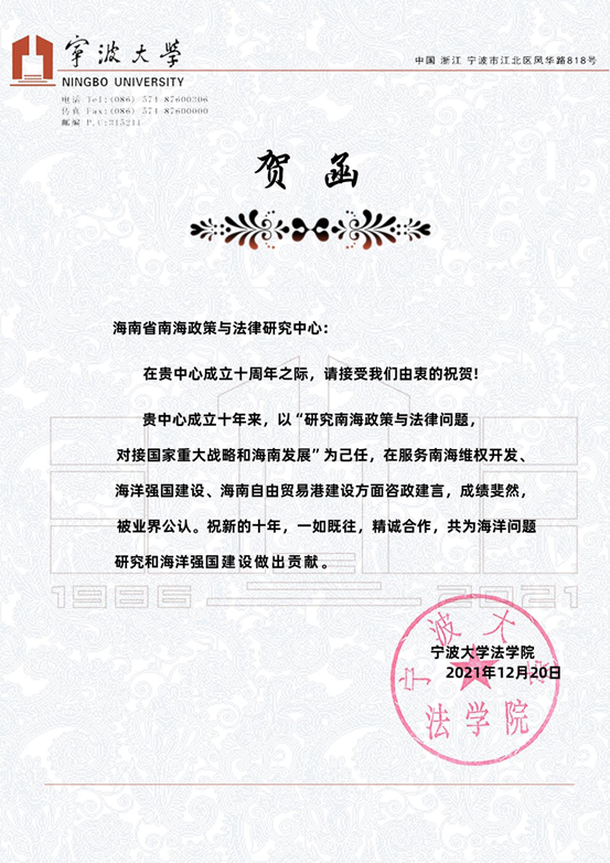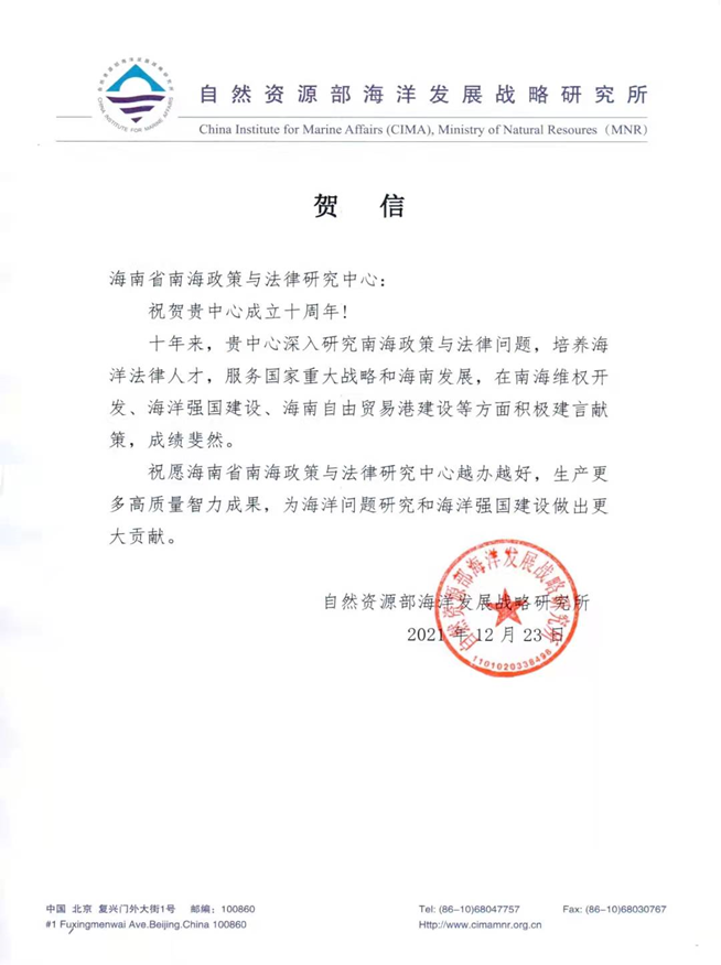 海南省南海政策与法律研究中心在成立10周年之际收到了18家国内兄弟院校、研究机构和有关部门的贺电、贺信、贺函。