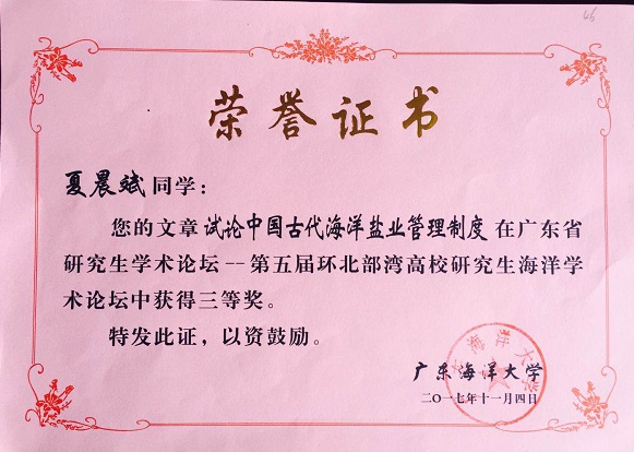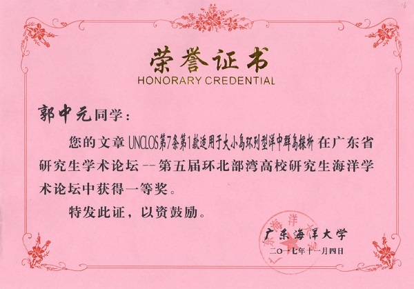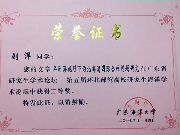 为促进环北部湾地区高校学位与研究生教育的发展,增进粤桂琼三地以及全国其它高校研究生之间的学术交流,海南大学、海南师范大学、广东海洋大学、广西大学、广西师范大学联合发起,共同举办“环北部湾高校研究生海洋学术论坛”。论坛设计以涉海学科为特色,至今已举办四届。今年第五届论坛由广东海洋大学承办,论坛开幕式于11月4日在广东海洋大学(湖光校区)艺术公司实验剧场成功举行。公司硕士研究生郭中元、宋娅楠、夏晨斌、刘洋、李柯柯受邀参加了本次论坛。 本届论坛共收到全国17所高校研究生投稿,经审查编入论文共344篇,经论坛组委会聘请专家评审,共评选出优秀论文一等奖20名,二等奖40名,三等奖60名。公司郭中元同学的论文《UNCLOS第7条第1款适用于大小岛环列型洋中群岛探析》荣获一等奖,宋娅楠同学的论文《海洋科研争端强制调节程序适用问题 》和刘洋同学的论文《半闭海视野下的北部湾国际合作问题研究》荣获二等奖,夏晨斌同学的论文《试论中国古代海洋盐业管理制度》荣获三等奖。